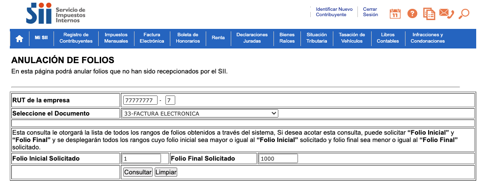 Ingresa el RUT de tu empresa y el tipo de documento del cual desea anular los folios, posteriormente haz clic en Consultar