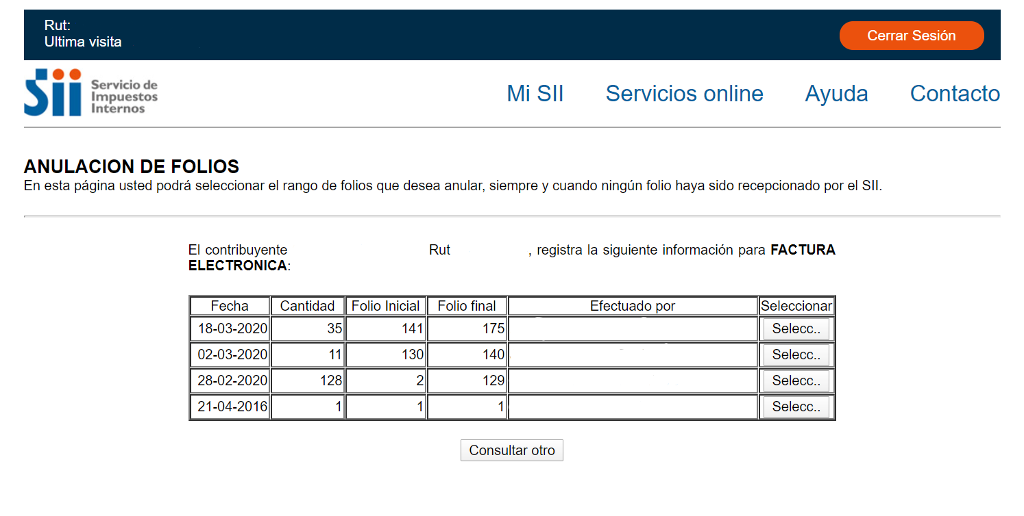 Selecciona el rango de folios en el cual se encuentra el o los folios que deseas anular presionando en seleccionar