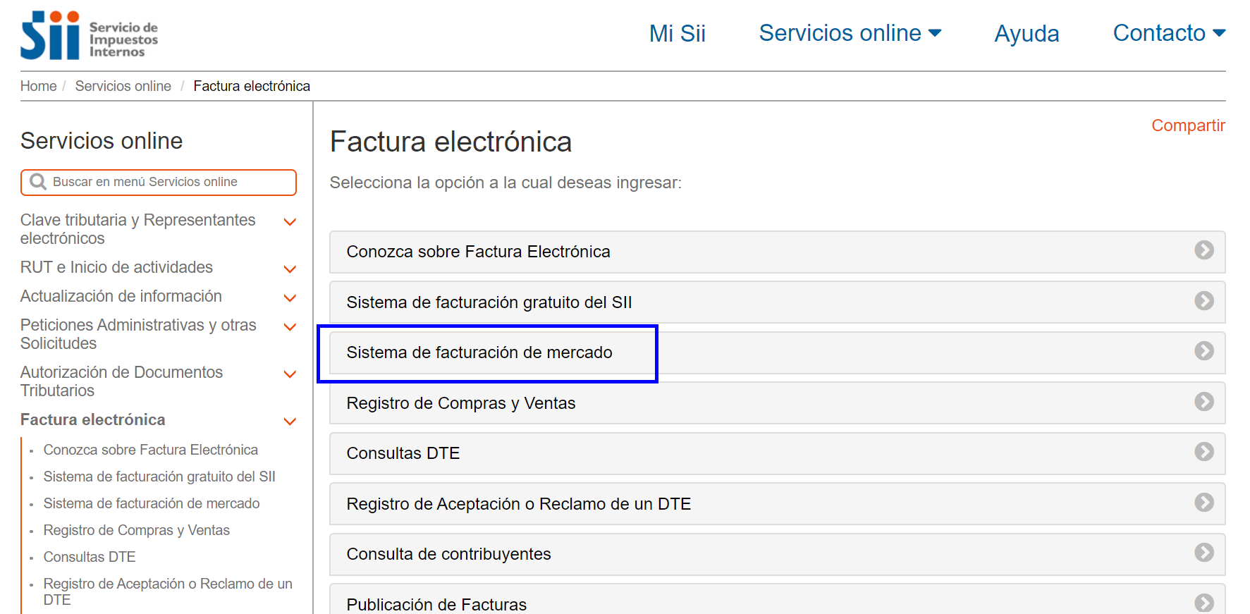 Haz clic en la opción Sistema de facturación de mercado