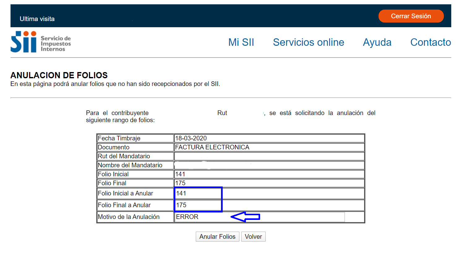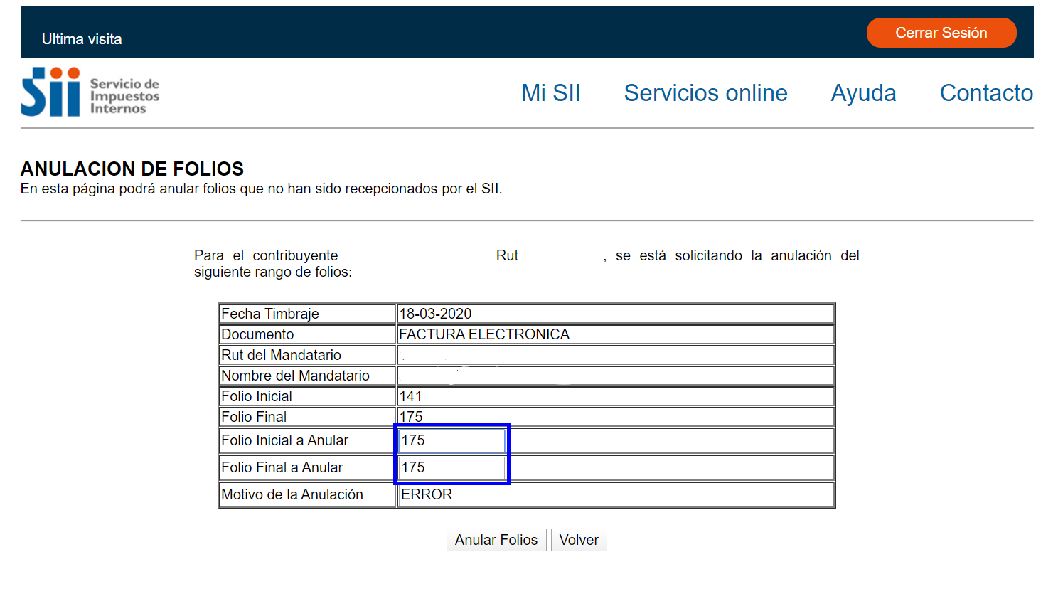 Ejemplo 2: En la imagen se requiere anular solo el folio 175, entonces inicial y final sería 175.