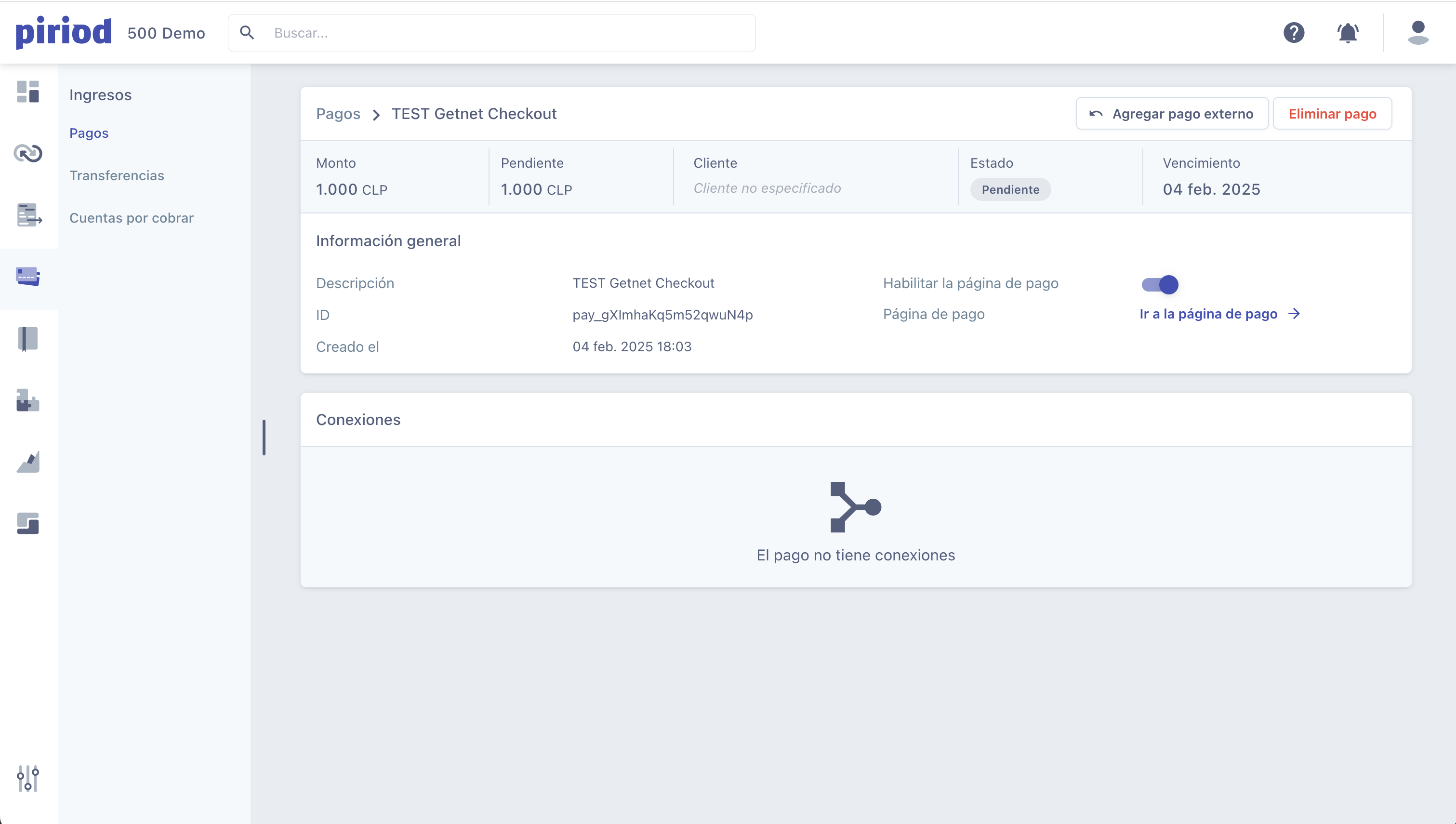 Finalmente, crea un pago de prueba por un monto mínimo (500 CLP) para probar que la integración esté correcta.